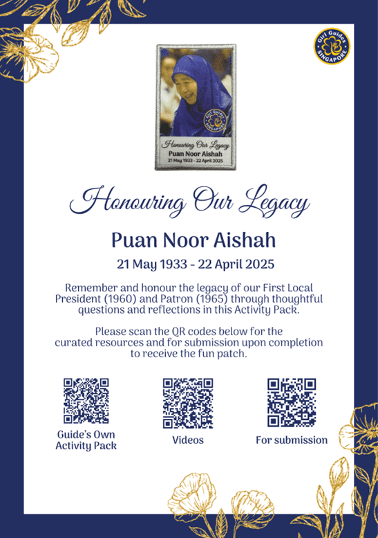 To remember and honour the legacy of Puan Noor Aishah, our First Local President (1960) and Patron (1965), an activity pack has been developed by our volunteers with thoughtful questions and interview reflections. Girls are encouraged to watch the interview videos and complete the reflective questions to learn about the contributions of Puan Noor Aishah to our Guiding movement. A fun patch is available for collection upon completion of the activity pack.
